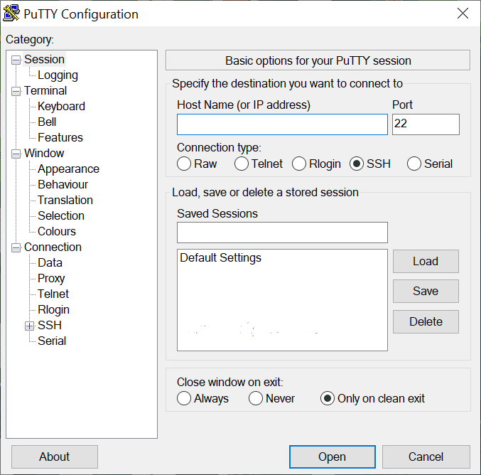 Once PuTTY is installed and you have the IP address, follow these steps to configure it: