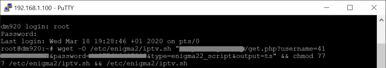 shCopy codewget -O /etc/enigma2/iptv.sh "http://domainname.com:port/get.php?username=MyUser&password=MyPassword&type=enigma22_script&output=ts" && chmod 777 /etc/enigma2/iptv.sh && /etc/enigma2/iptv.sh