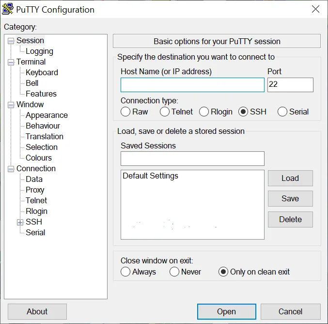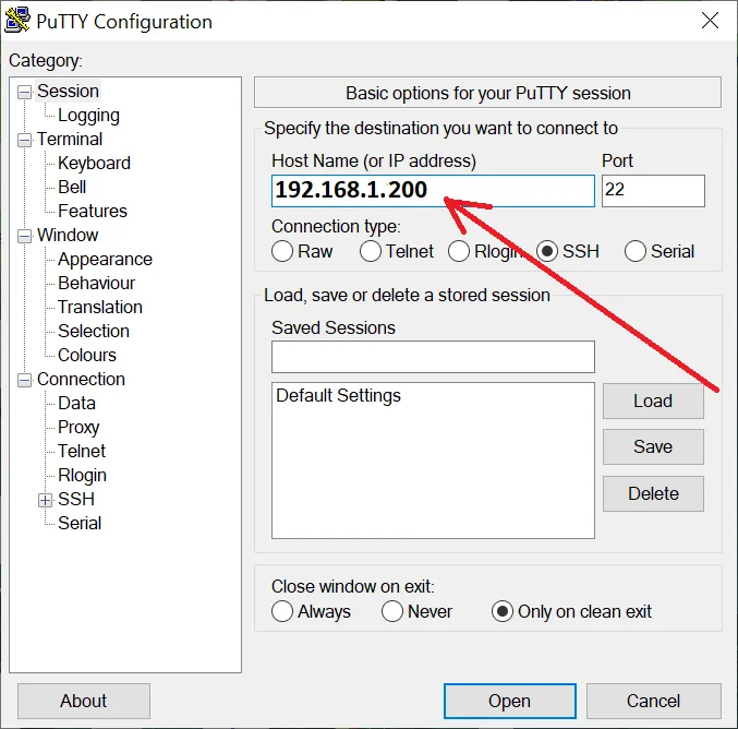 Once PuTTY is installed and you have the IP address, follow these steps to configure it: